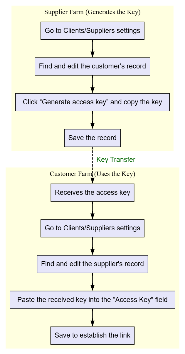 The Customer/Supplier will receive the key from you and will perform the same step-by-step procedure as you did. Instead of generating an access key, they will paste the key (code) they received from you into the "access key" field.