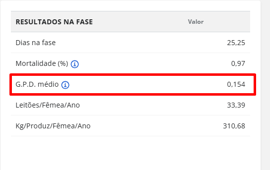 DiasNaFase: Média de dias que os animais do(s) lote(s) ficaram alojados na fase.
