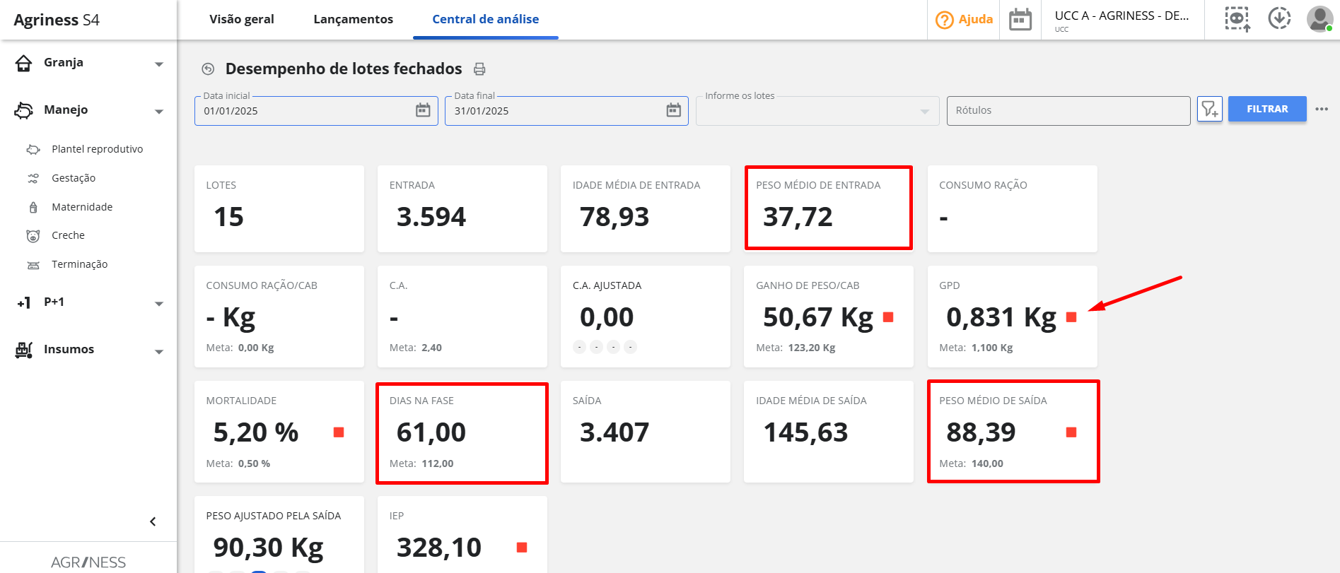 1. Acesse Manejo > Creche/Terminação > Central de Análises > Desempenho de lotes fechados