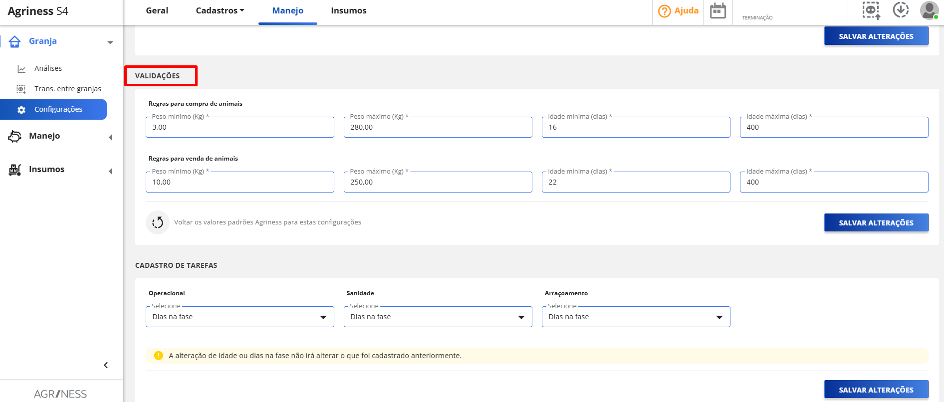Em Granja > Configurações > Manejo, você poderá conferir as metas e validações separadas por fase da granja.